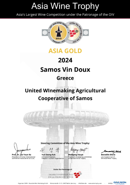 Ο διαγωνισμός Asia Wine Trophy διεξάγεται κάθε χρόνο στη Νότια Κορέα με τη συμμετοχή περισσότερων από 4.000 ετικετών από διάφορες χώρες, έχοντας ως κριτές άτομα υψηλού κύρους, με διεθνείς περγαμηνές. Η διαδικασία γευσιγνωσίας ακολουθεί αυστηρά πρωτόκολλα τυφλής δοκιμής, εξασφαλίζοντας αντικειμενικότητα και αξιοπιστία. Η βράβευση σε αυτόν τον θεσμό αποτελεί πραγματική σφραγίδα ποιότητας και διεθνούς αναγνώρισης, κάτι που απολαμβάνουν άλλωστε τα μοσχάτα σαμιώτικα κρασιά, σε ολόκληρον τον κόσμο.