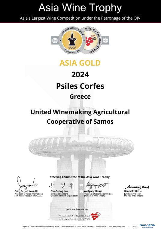 Με ΧΡΥΣΟ ΒΡΑΒΕΙΟ τιμήθηκαν και πάλι οι οινικές «ναυαρχίδες» του Συνεταιρισμού Σάμου, οι ΨΗΛΕΣ ΚΟΡΦΕΣ και το SAMOS VIN DOUX, στον πιο έγκυρο και αδιάβλητο διαγωνισμό της Ασίας, «ASIA WINE TROPHY» που τελεί υπό την αιγίδα της OIV (Διεθνούς Οργάνωσης Αμπέλου και Οίνου).